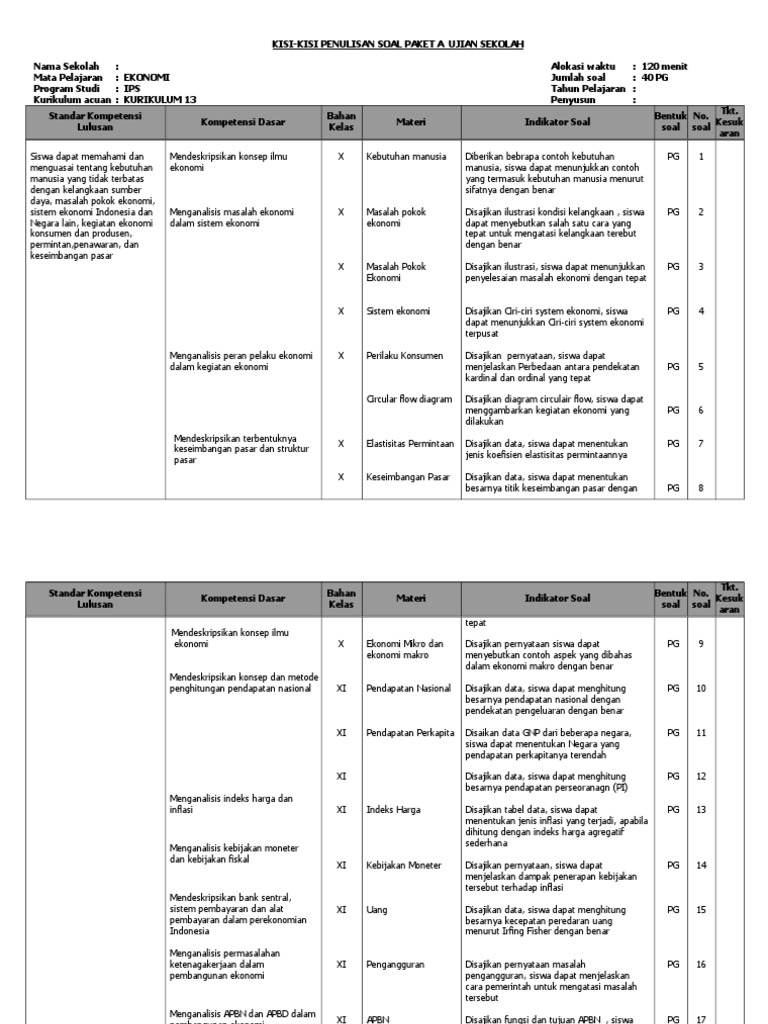 KISI-KISI SOAL UJIAN EKONOMI SMA TAHUN 20152016. Kiranya begitulah pembahasan tentang Format Kisi-Kisi butir Pertanyaan Kurikulum 2013 Revisi 2019 mudah-mudahan bisa dijadikan sebagai penambah informasi dan referensi dalam pembuatan formatnya. Kisi-Kisi Soal PAS Ekonomi Kelas 10 Pada artikel kali ini admin akan berbagi file yang berisikan Kisi-Kisi Soal PAS Ekonomi Kelas 10 Semester 1.