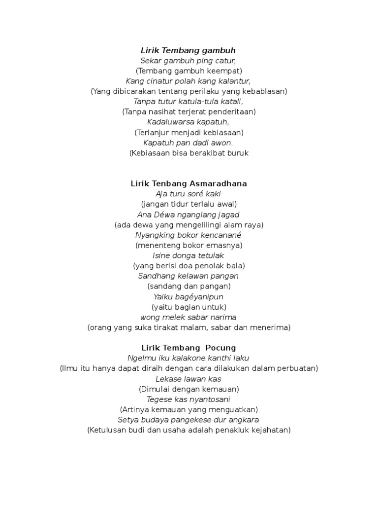 Lan sembang sungkem ipun Mring Hyang Sukma elinga sireku Apan titah sadaya among sadermi Tan welangsira andhaku Kabeh kagungan Hyang Manon. Contoh tembung macapat gambuh lirik macapat kinanthi contoh syair tembang pocung lagu lagu macapat lirik macapat sinom dandanggula tema pendidikan syair macapat contoh tembang macapat kinanthi. Tembang Gambuh berasal dari kata jumbuh dalam bahasa Jawa yang artinya sesuai tepat atau kecocokan kesepahaman serta kebijaksanaan.