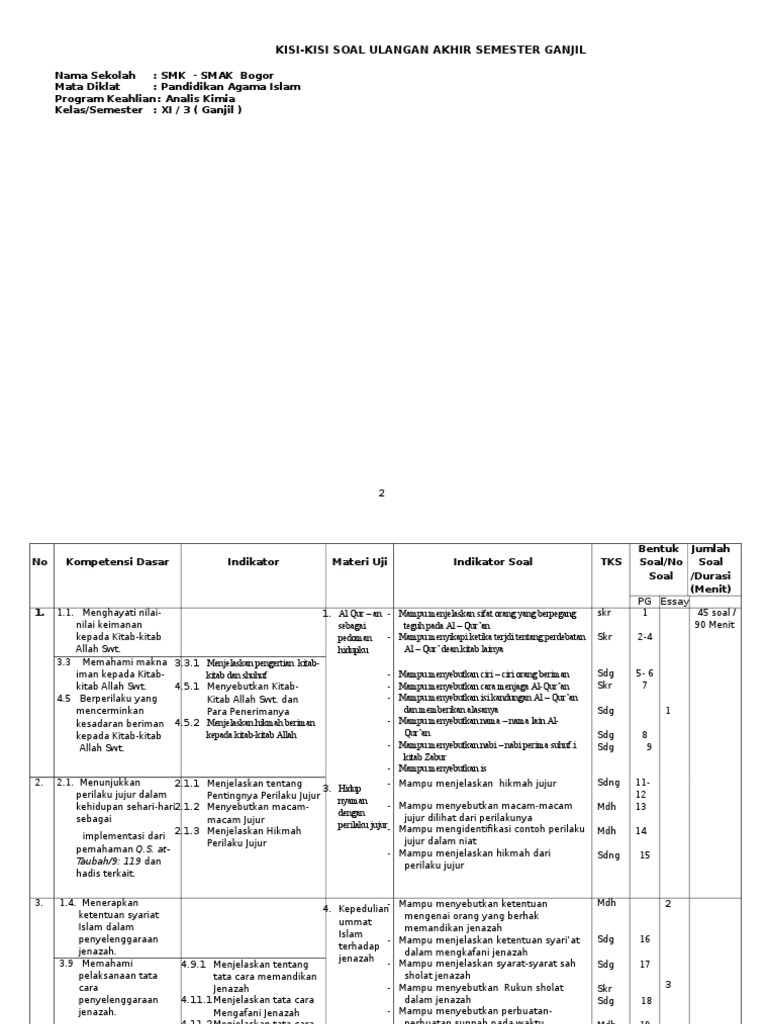 Kisi-kisi USBN disusun berdasarkan Kurikulum 2006 dan Kurikulum 2013. Kisi kisi usbn pai sma a. Kisi-Kisi Ujian Kisi-kisi ujian merupakan acuan dalam pengembangan dan perakitan soal USBN PAI dan BP yang disusun berdasarkan kriteria pencapaian kompetensi lulusan standar isi dan kurikulum yang berlaku.