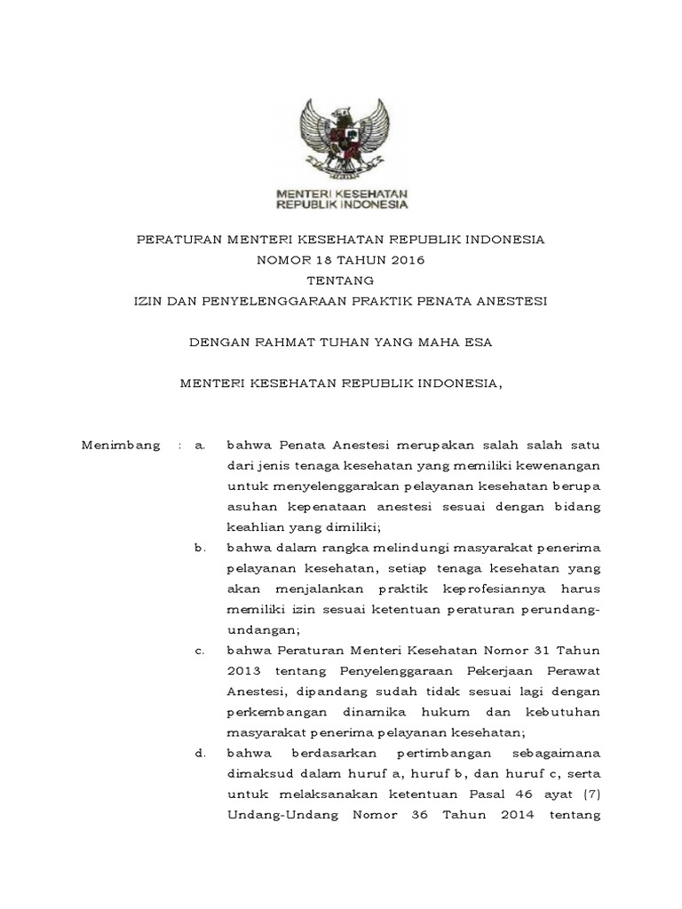 Pmk No 18 Ttg Izin Dan Penyelenggaraan Praktik Penata Anestesi