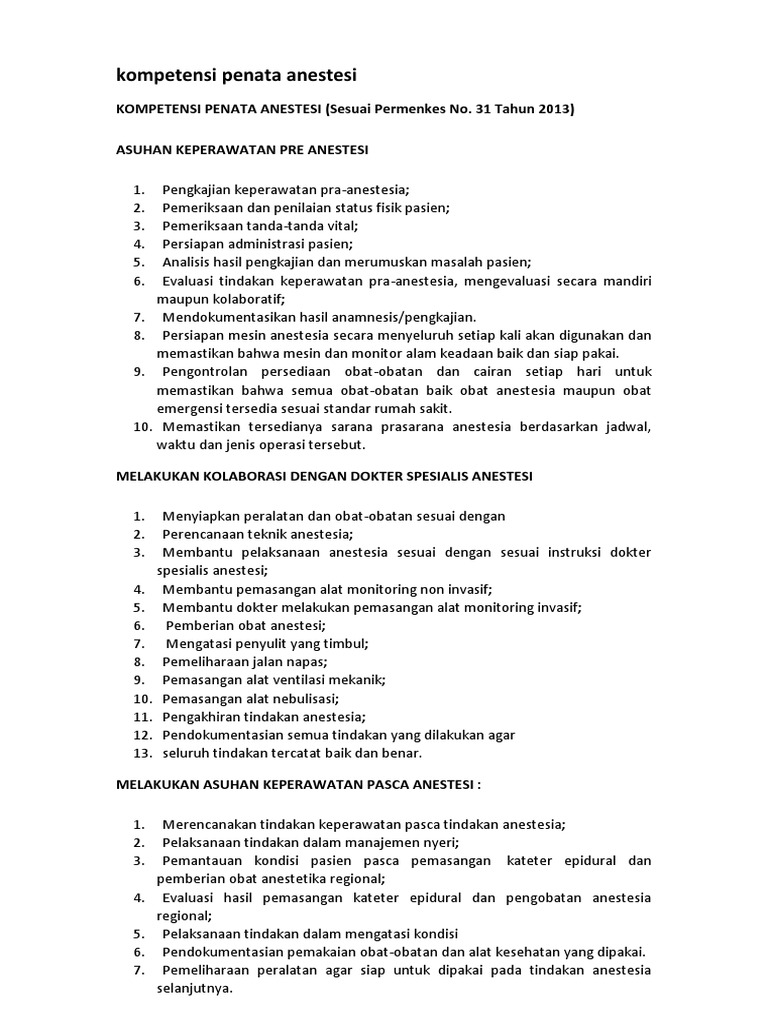 4 Dalam halada dokter spesialis anestesiologi maka tugas Perawat. Rumah Sakit R Regulasi tentang pelayanan anestesi sedas1i 0 TL menetapkan moderat dan dalam termasuk keseragaman regulasi tentang pelayanan anestesi sedasi moderat dan dalam. Semua nomenklatur Perawat Anestesi dalam Peraturan Menteri Kesehatan Nomor 519MenkesPerIII2011 tentang Pedoman Penyelenggaraan Pelayanan Anestesiologi dan Terapi Intensif Di Rumah Sakit Berita Negara Republik Indonesia Tahun 2011 Nomor 224 harus dibaca dan dimaknai sebagai Penata Anestesi.