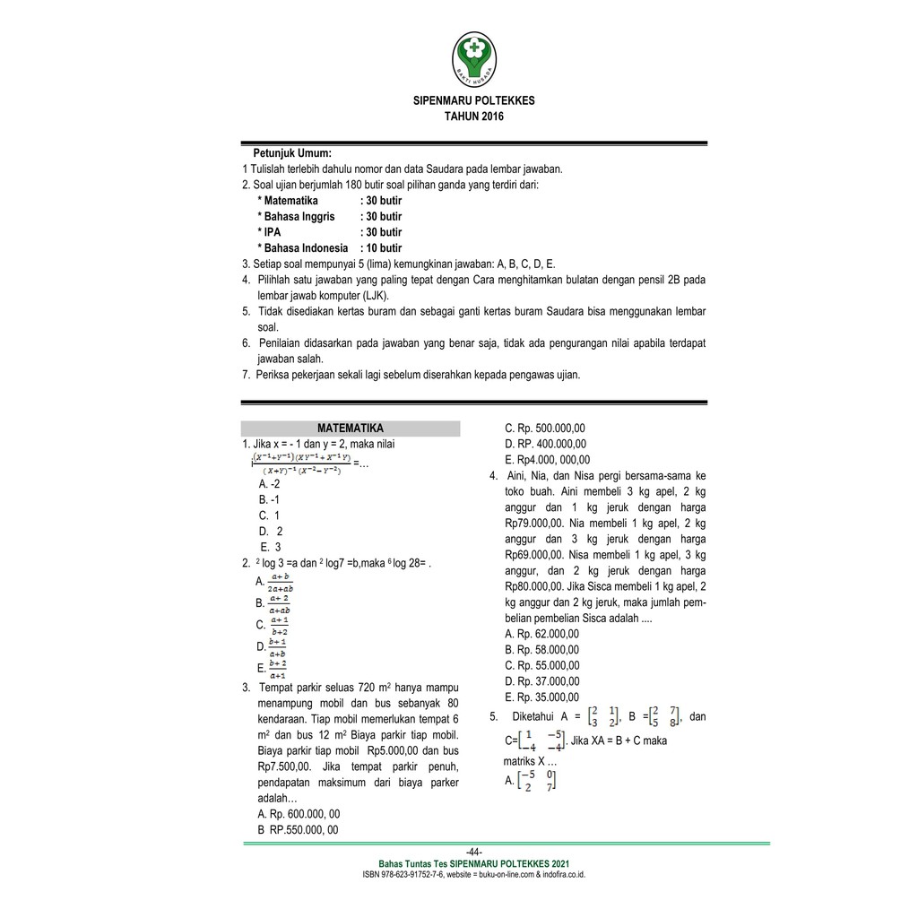 Buku Tes Sipenmaru Poltekkes 2021 Untuk Ujian Tulis Masuk Poltekkes Se Indonesia Shopee Indonesia
